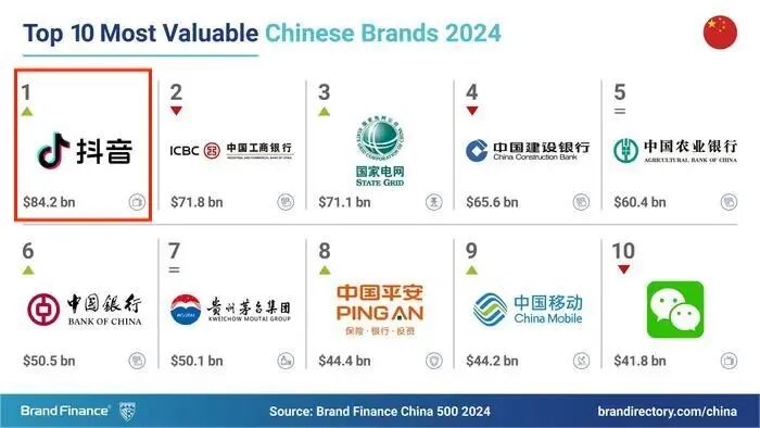 在2024年中国品牌价值500强的榜单中,抖音拿下第一名的位置。报告显示,2024年,抖音的品牌价值实现了28%的增长,达到了842亿美元,当前折合人民币约6083亿。这也是抖音首次登上榜首。