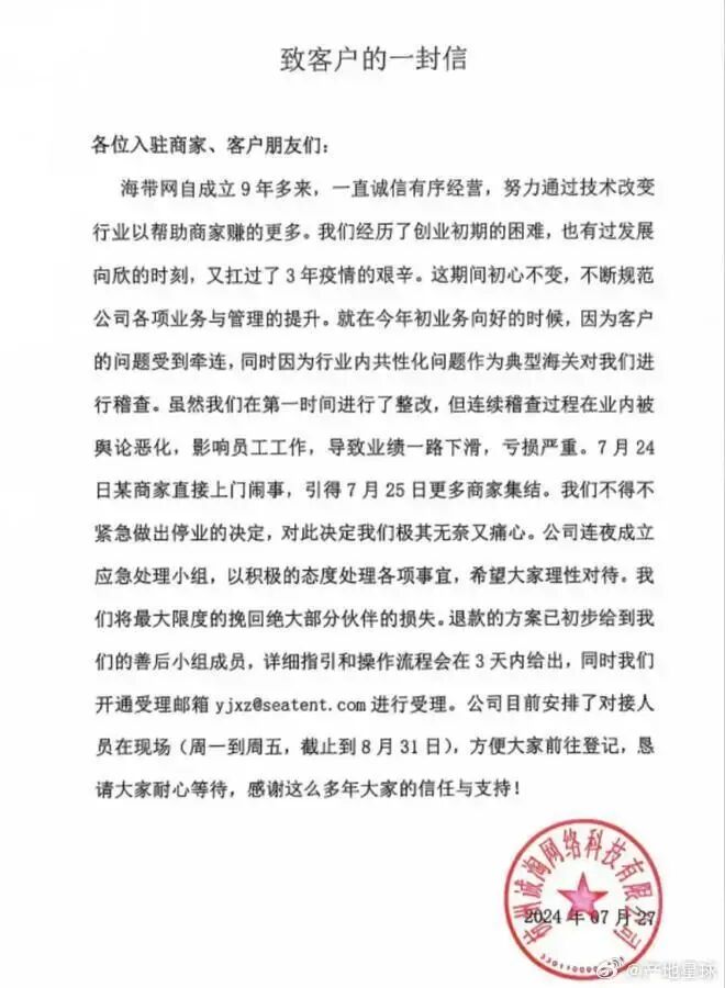 实际上,海带网的“暴雷”并非毫无预兆。早在媒体曝光前一天,网络上就已流传出供应商上门维权的视频。而公司方面则发布了一封《致客户的一封信》,解释称因客户问题受到牵连,同时海关稽查导致业绩持续下滑,亏损严重。