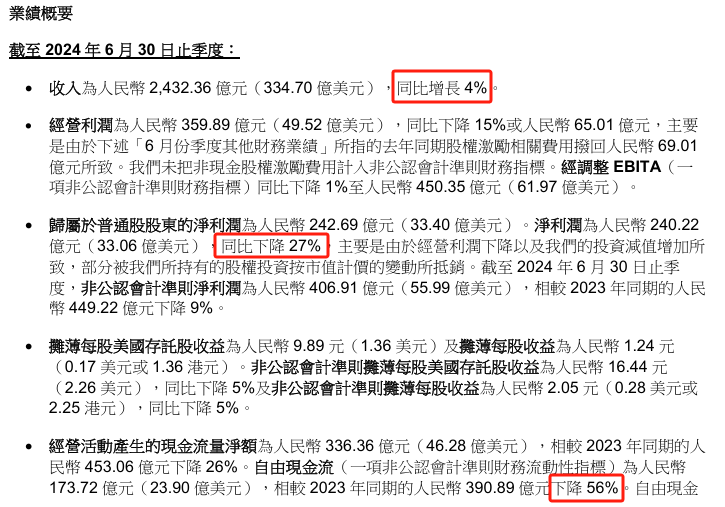 2024 年 8 月 15 日,阿里巴巴集团控股有限公司发布《2024 年六月底止季度业绩公告》。