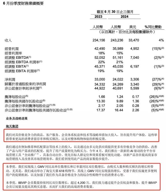 “二季度的88VIP会员数量实行持续同比双位数增长”,这是在阿里财报中被特别提到的一个信息。