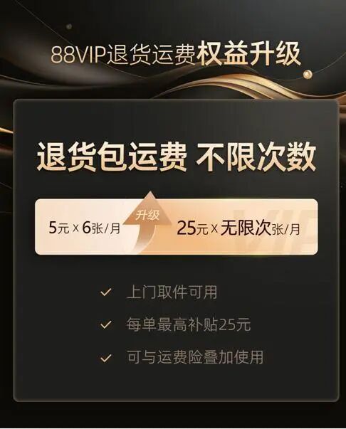 具体而言,原先88VIP们每月可享的6张5元退货券被升级为了无限次退货包运费服务,每单退货最高补贴25元邮费,不限次数,并且可与运费险叠加使用。