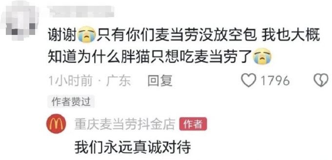 当然了,在此前的“胖猫空包事件”中,我们也能感受到麦当劳的高标准和对顾客的重视。在众多商家选择发空包外卖时,麦当劳是为数不多的实打实的把食物送来的商家。麦当劳还因此获得了一波好感。