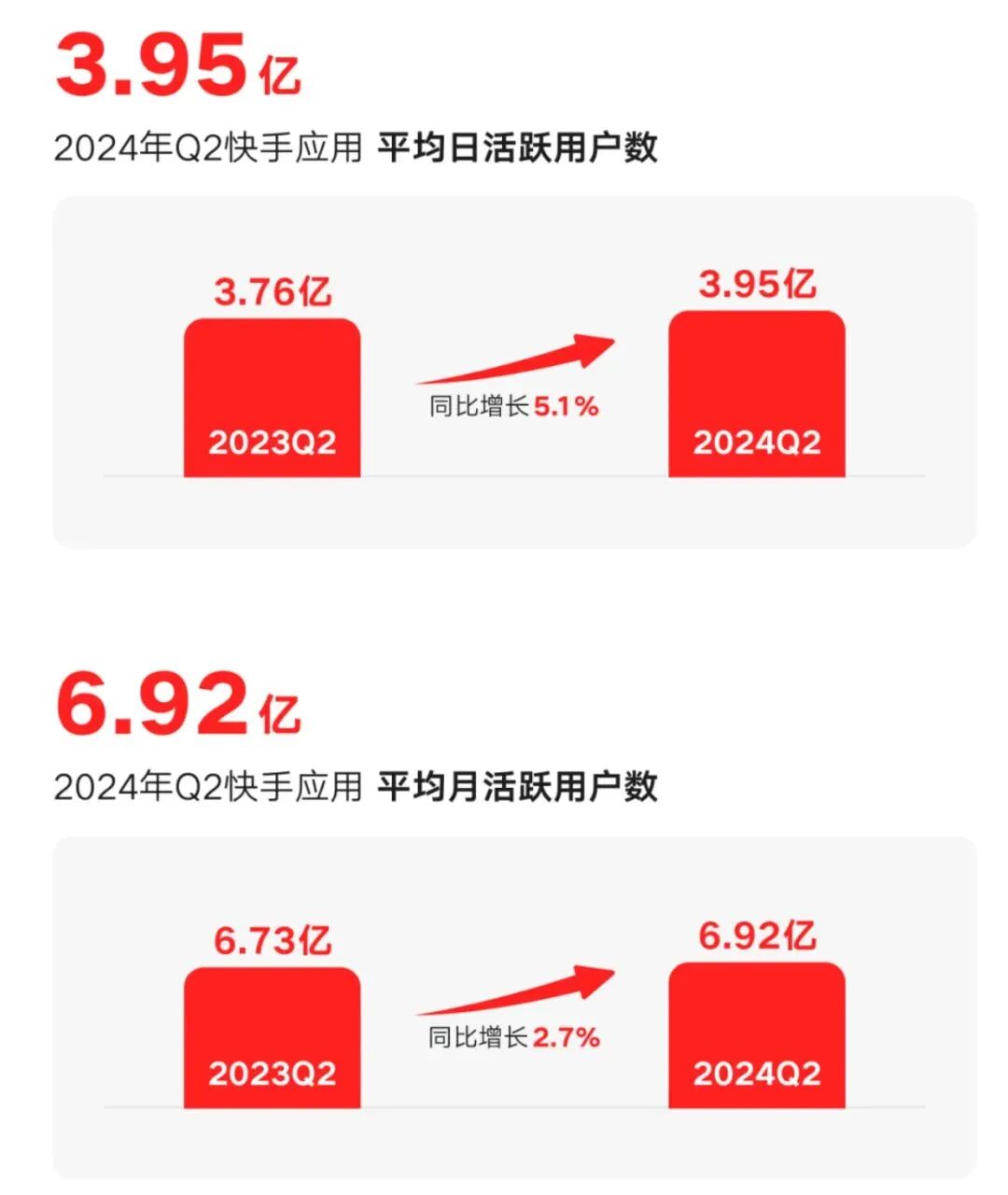而且,凭借卓越的AI技术实力、充满活力的内容创作环境以及不断精进的算法优化策略,本季度快手平均日活跃用户达3.95亿,较去年同期实现了5.1%的增长,平均月活跃用户达6.92亿,同比增长2.7%。