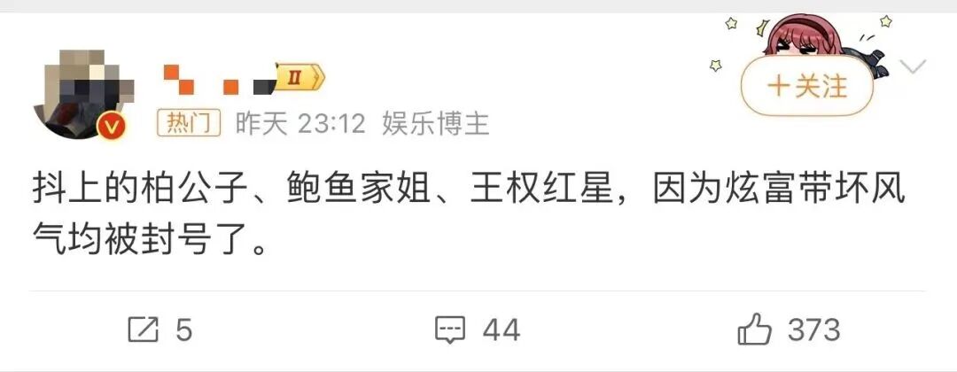 “王红权星、鲍鱼家姐、柏公子”等多名百万级粉丝网红,集体被封禁或禁言!而他们最大的一个共同点,便是喜欢在自己的社交账号上“炫富”。