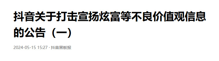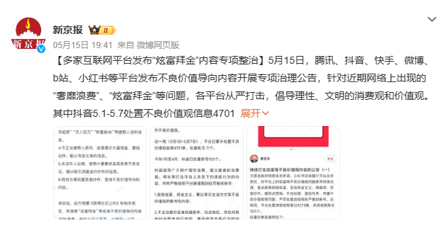 就在不久前的5月15日,腾讯、抖音、快手、微博、B站、小红书等平台均发布不良价值导向内容专项治理公告,针对近期网络出现的“奢靡浪费”“炫富拜金”等问题,各平台从严打击,倡导理性、文明的消费观和价值观。