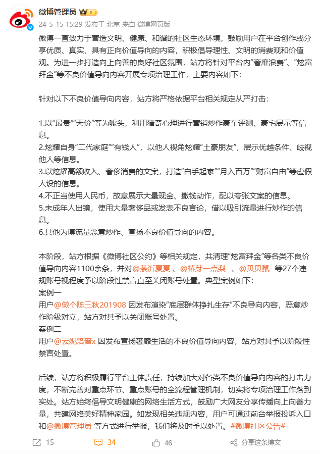 微博公告则显示,目前共清理“炫富拜金”等各类不良价值导向内容1100余条,并对27个违规账号视程度予以阶段性禁言直至关闭账号处置。