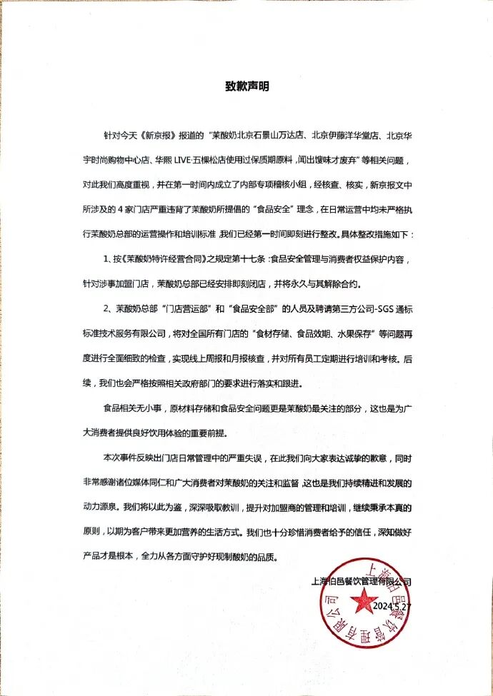 5月27日下午,面对消费者的质疑和舆论的压力,茉酸奶迅速回应,发出《致歉声明》,表示总部已经安排对涉事的茉酸奶北京石景山万达店、北京伊藤洋华堂店、北京华宇时尚购物中心店进行闭店处理,并将永久解除与这三家店的合约;也将以此为鉴,深深吸取教训,提升对加盟商的管理和培训。