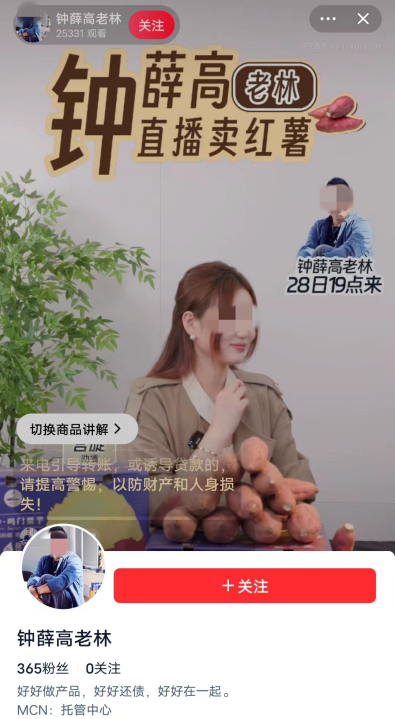 在直播间背景中可以很清楚的看到“钟薛高老林直播卖红薯”“钟薛高老林28日19点来”两句话。
