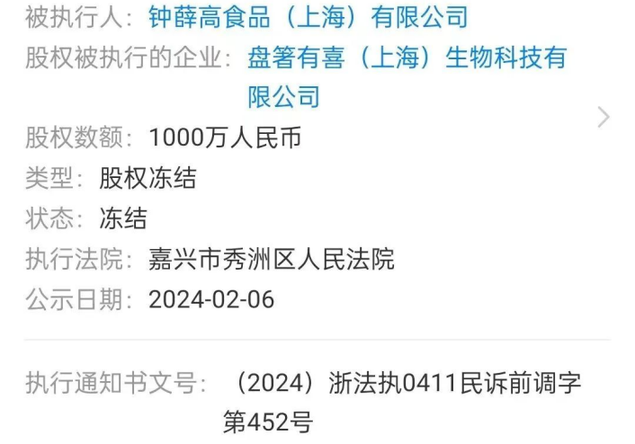 除了限高,更早之前,还有媒体曝出钟薛高股权冻结等消息。据天眼查显示,今年2月,钟薛高食品(上海)有限公司新增3则股权冻结信息,涉及旗下3家公司,冻结股权数额分别为2000万人民币、1000万人民币、500万人民币,冻结期限自2024年2月6日至2027年2月5日。
