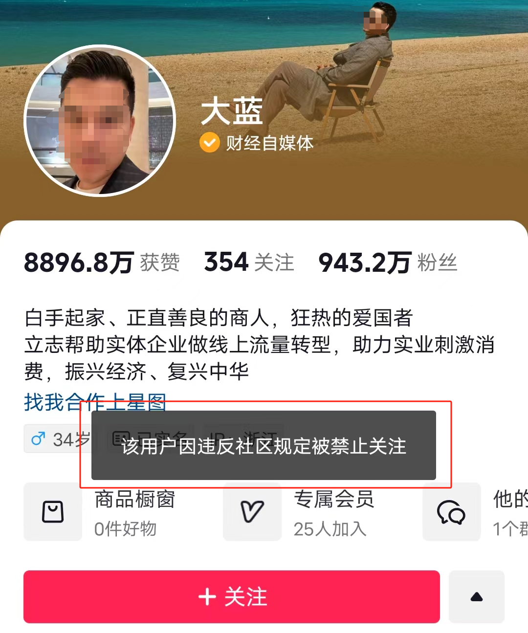 5月31日,有网传消息称,在抖音平台拥有近千万粉丝的财经自媒体博主“大蓝”,其账号被官方禁止关注。据了解,不久前“大蓝”的账号直播功能就曾被封禁30天。
