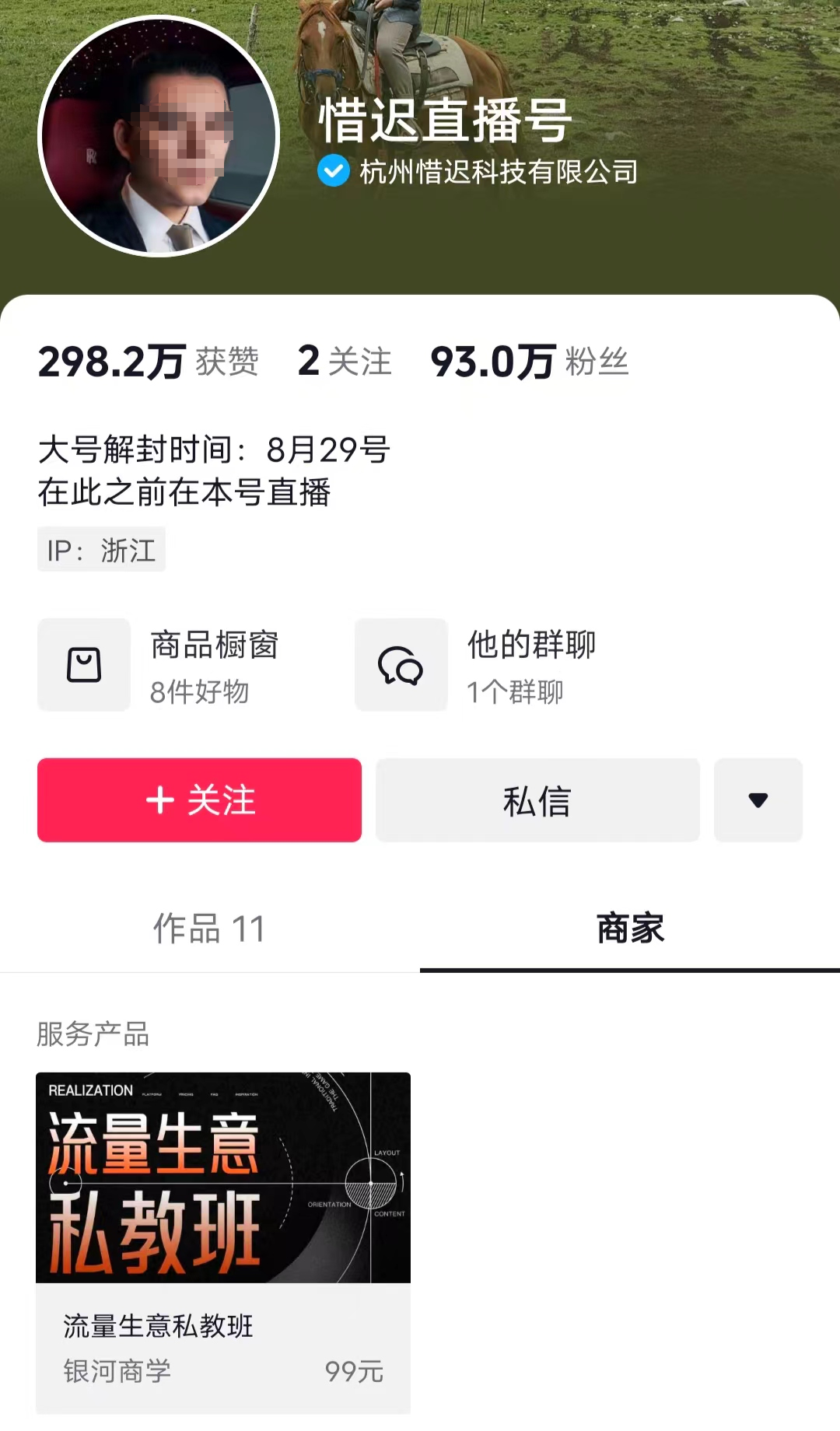 今天上午10点,有网友发现,在名为“惜迟直播号”的账号里,大蓝再次开播,直播中右下角还弹出与此前大号课程类似的流量生意速成班课程链接。
