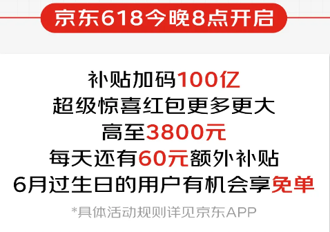 京东方面发布消息,今年618从6月17日晚8点开始,将追加超100亿投入用于用户补贴,并推出“超级惊喜红包”,红包额度高达3800元。从6月17日晚8点开始,京东618大促正式拉开帷幕,用户可叠加使用“超级惊喜红包”,享受前所未有的优惠。更值得一提的是,今年的618还是京东的21周年庆,京东特别推出“生日礼金”活动,6月份过生日的用户当天下单并使用京东支付,有机会享受高达5万元的免单福利。