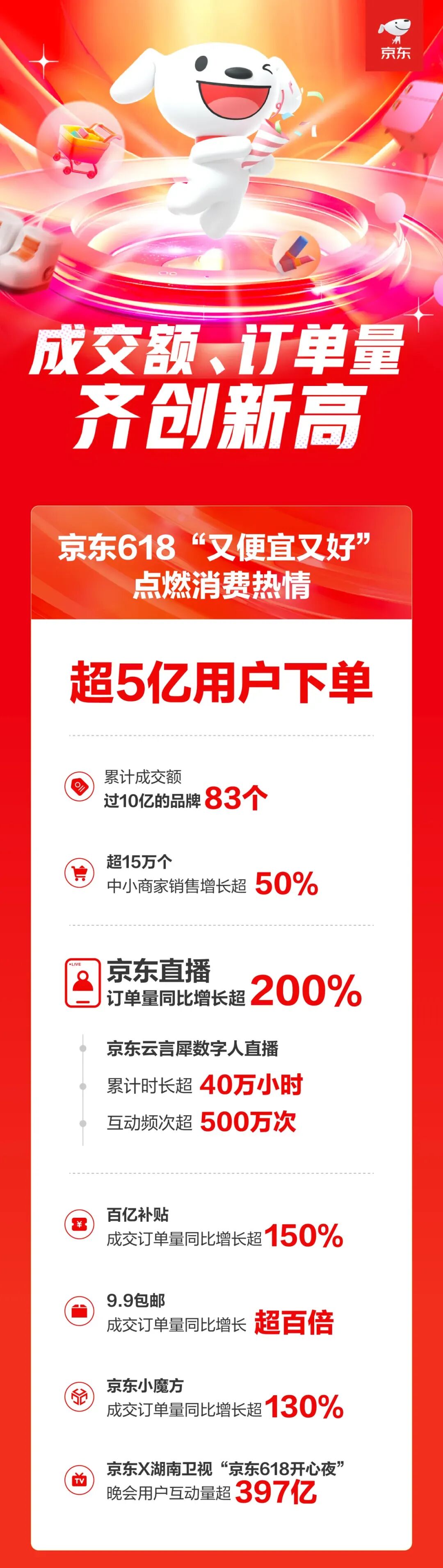 京东方面,今年的618购物节再次刷新了成交纪录。截至6月18日23:59,京东的成交额和订单量均创历史新高,直播订单量同比增长超过200%。超过5亿用户参与了此次购物狂欢,其中累计成交额过10亿的品牌达到83个,超15万个中小商家销售增长超过50%。京东直播间更是热闹非凡,数百位品牌总裁空降直播间送出红包雨等多重福利,其中宝洁、vivo、美的等TOP10品牌备受用户关注。