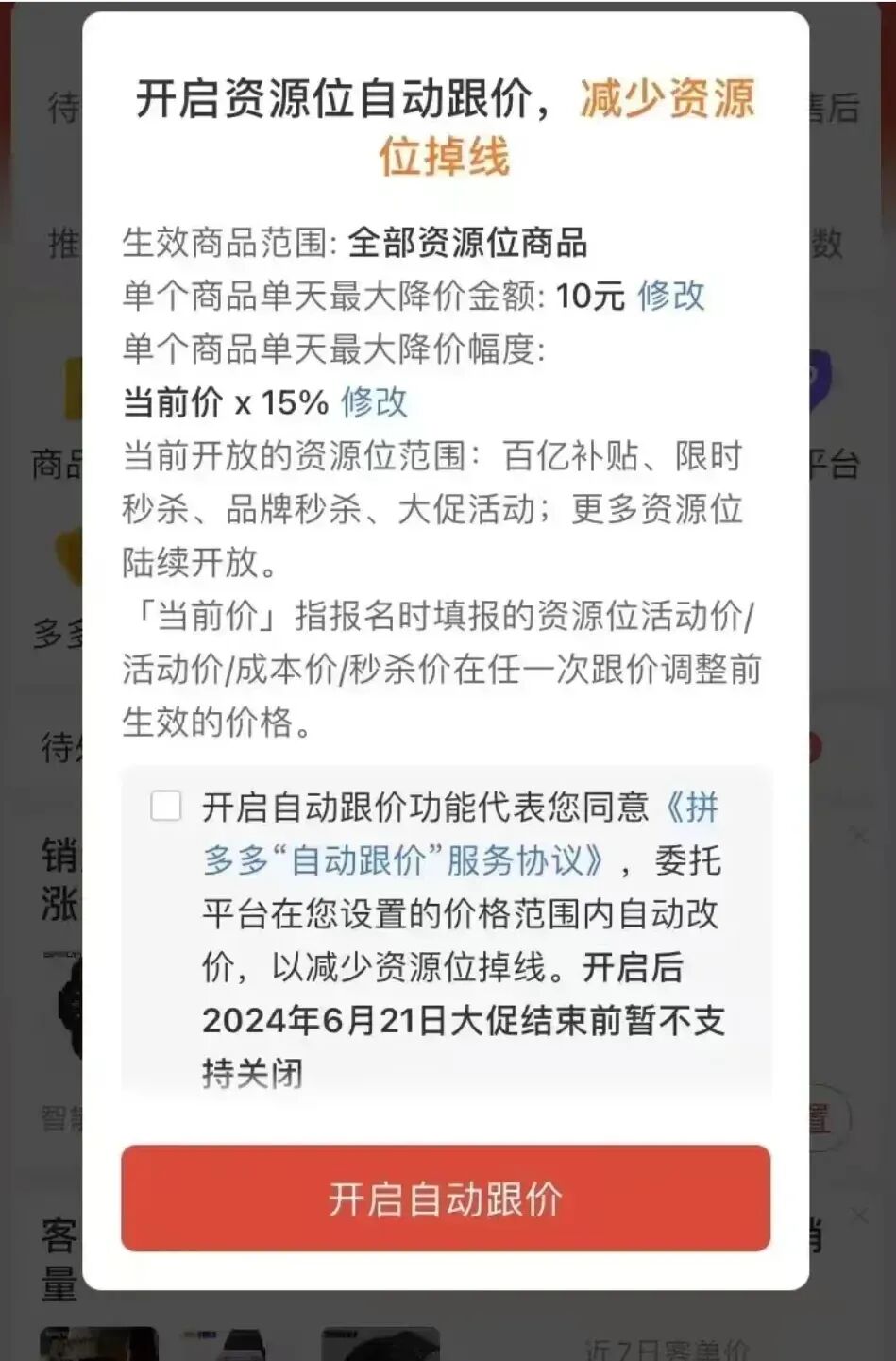 同时,低价仍然是各平台大促的核心。有平台直白的打出了“全网低价”“不怕比”的标语。拼多多还被媒体曝出上线了自动跟价系统,如若商家同意开启自动跟价,则就是同意委托平台在商家设置的价格范围内自动改价,以减少资源位掉线,商家一旦同意开启,在2024年6月21日大促结束前都不支持关闭该系统。