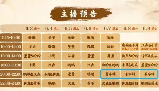 根据与辉同行发布的6月3日到6月9日这一周的主播预告也可以发现,董宇辉在有意减少直播频次,七天时间里他只出现过3次,其余时间均由与辉同行其他主播进行带货。