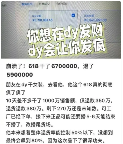 6月初,一则 #某电商女装商家吐槽退货率高达80%# 的词条还登顶热搜,有网友称,自己朋友的女装网店,618期间其店铺的营业额为1000万元左右,但仅退款数额为350万元、退货退款数量为380万。