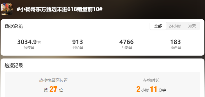 这两天有一个热搜话题叫“小杨哥东方甄选未进618销量前10”,不知道大家有没有注意到。
