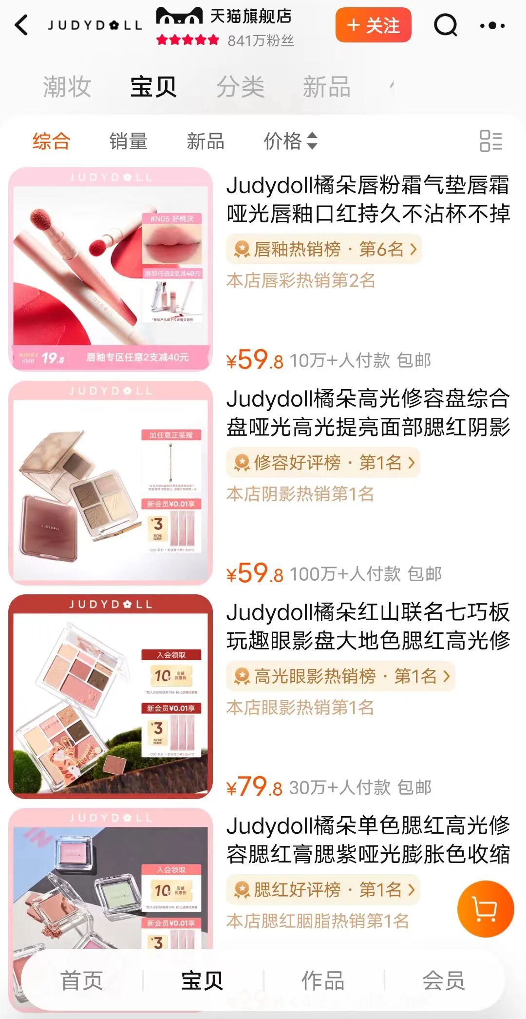 另外,店铺里除了两款眼影销量过万,遮瑕精华养肤遮瑕销量超6000件,其余的单品销量均在500件到1000件左右。