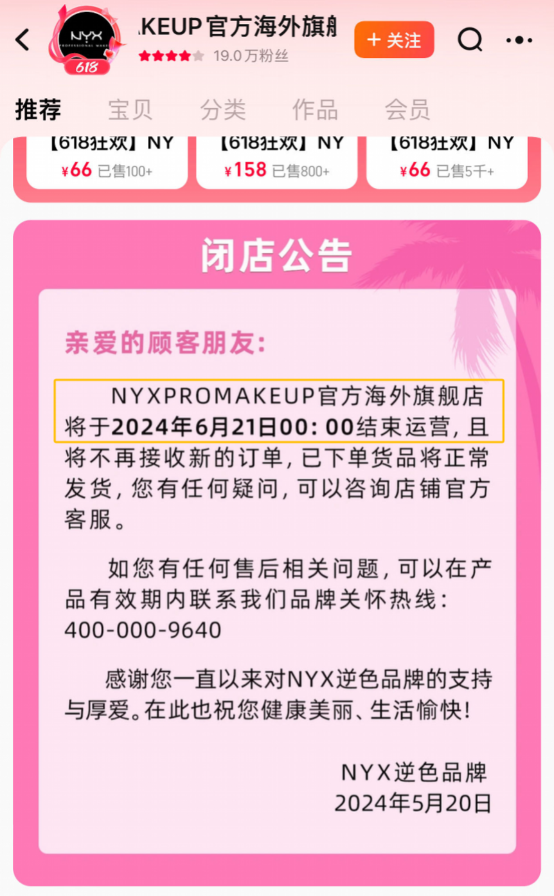 前几天,欧莱雅集团旗下平价彩妆品牌NYXPROMAKEUP(以下简称NYX)天猫官方海外旗舰店突然发布公告称,将于2024年6月21日零点结束该平台店铺运营,且将不再接受新的订单。