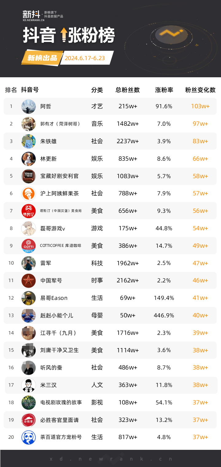 据新榜公布的抖音涨粉榜显示,从2024年6月17日至6月23日的一周内,“郭有才(菏泽树哥)”以超过97万的新增粉丝量位列榜单第二,仅次于前YY顶流主播“阿哲”。这一成绩不仅证明了郭有才在粉丝心中的地位,也显示了他作为网红的影响力和号召力。