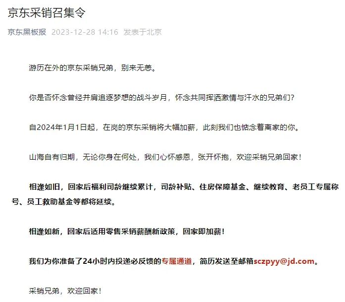 去年12月,京东发布“采销召集令”,召集前采销员工回归,并表示员工入职后福利司龄继续累计,司龄补贴、住房保障基金、继续教育、老员工专属称号、员工救助基金等都将延续,适用零售采销薪酬新政策,“回家即加薪”。