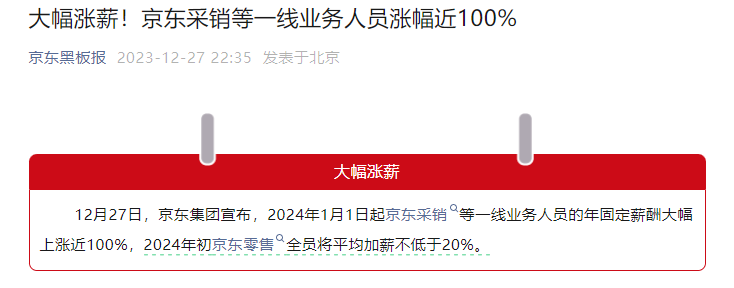 这里的“回家即加薪”指的是去年12月27日,京东集团宣布的薪酬调整计划,自2024年1月1日起,京东采销等一线业务人员的年固定薪酬大幅上涨近100%。
