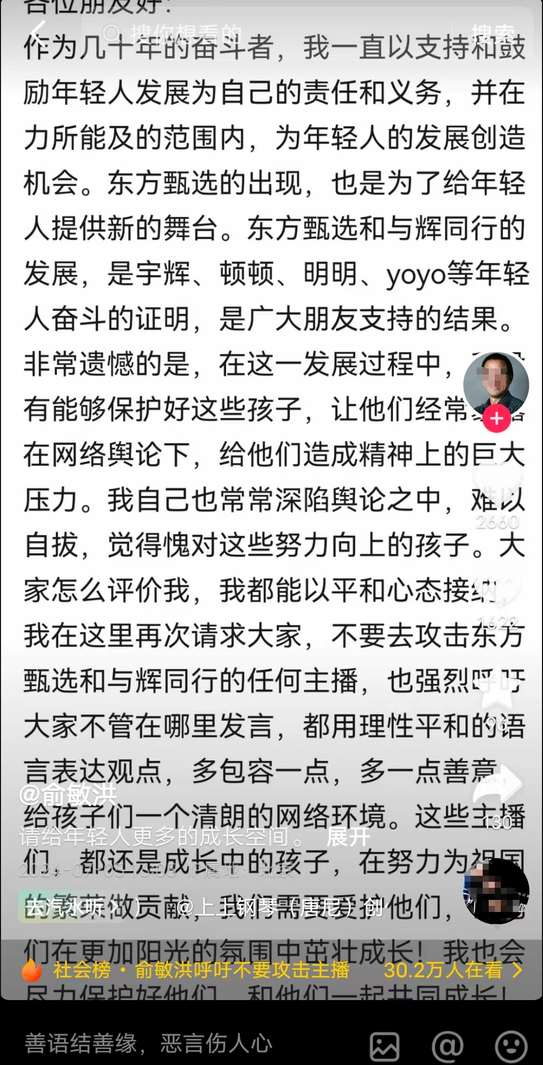 俞敏洪在视频中坦言,东方甄选的成立初衷是为年轻人提供展示自我、实现梦想的舞台。他强调,东方甄选及与辉同行的每一步成长,都是宇辉等年轻主播不懈奋斗与广大消费者支持的结果。然而,在这一过程中,他深感自责,认为自己未能充分保护这些年轻主播免受网络舆论的侵扰,给他们带来了巨大的精神压力。