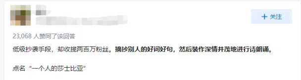 二是因为涉嫌抄袭。其实关于“一莎”视频涉嫌抄袭的说法由来已久,特别是在知乎上。在知乎上的一个热议话题“你最讨厌的抖音视频是什么?”下面有这样一个回答:“低级抄袭手段,却收获两百万粉丝。摘抄别人的好词好句,然后装作深情并茂地进行诗朗诵。点名‘一个人的莎士比亚’”而且这个回答拥有两万多赞。