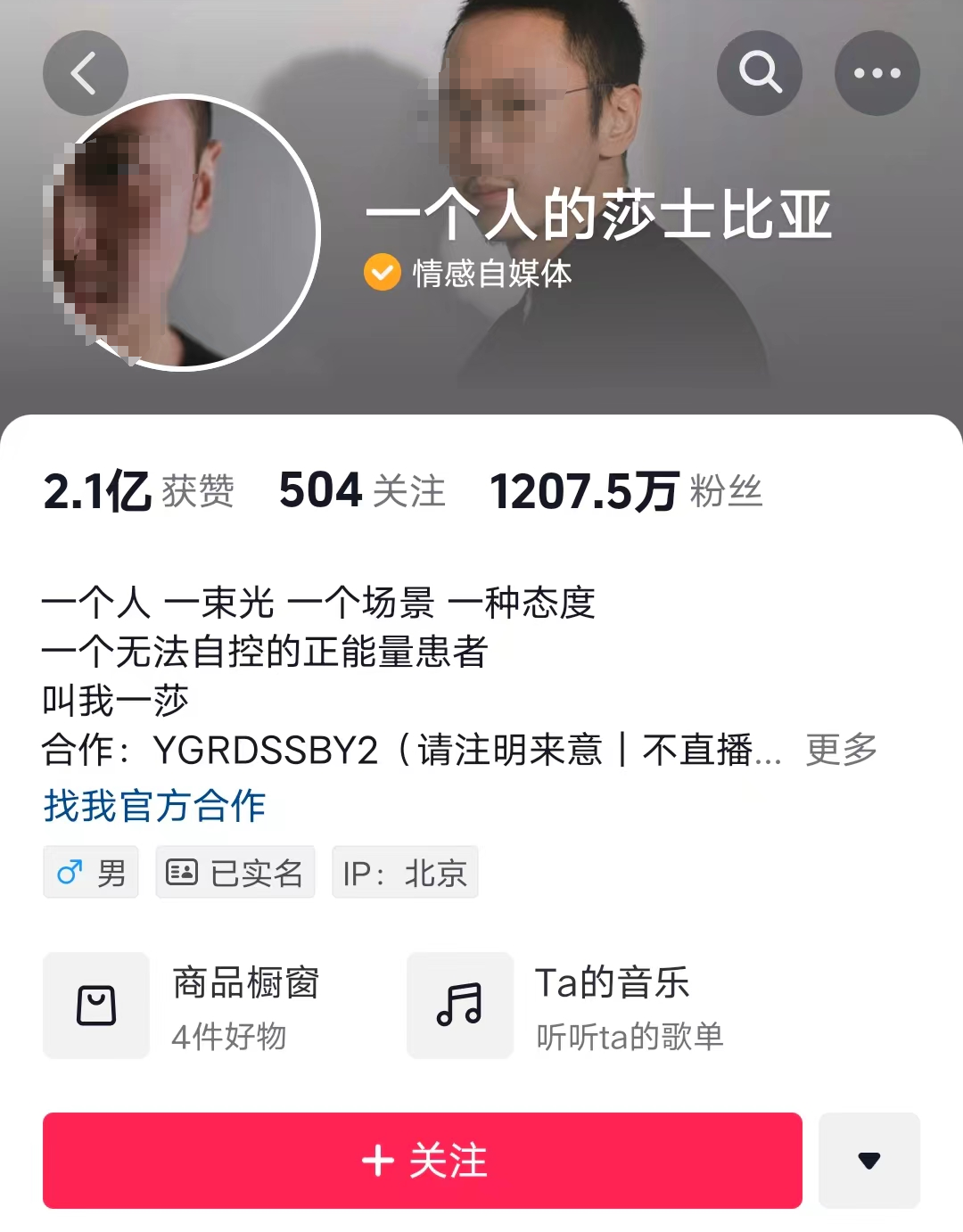 网红博主“一莎”在多个社交平台都有账号,其中粉丝量最多的是他的抖音账号,拥有超1200万粉丝。