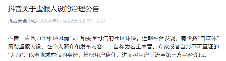 7月22日晚,抖音安全中心发布《关于虚假人设的治理公告》(下称治理公告),公告指出,近期平台发现,有少数“自媒体”策划虚假人设,在个人简介和发布内容中,自称为名企高管、专家或者自封不可查证的“大师”,以夸张或虚假的身份,博取用户信任,进而将用户引流至第三方平台变现。