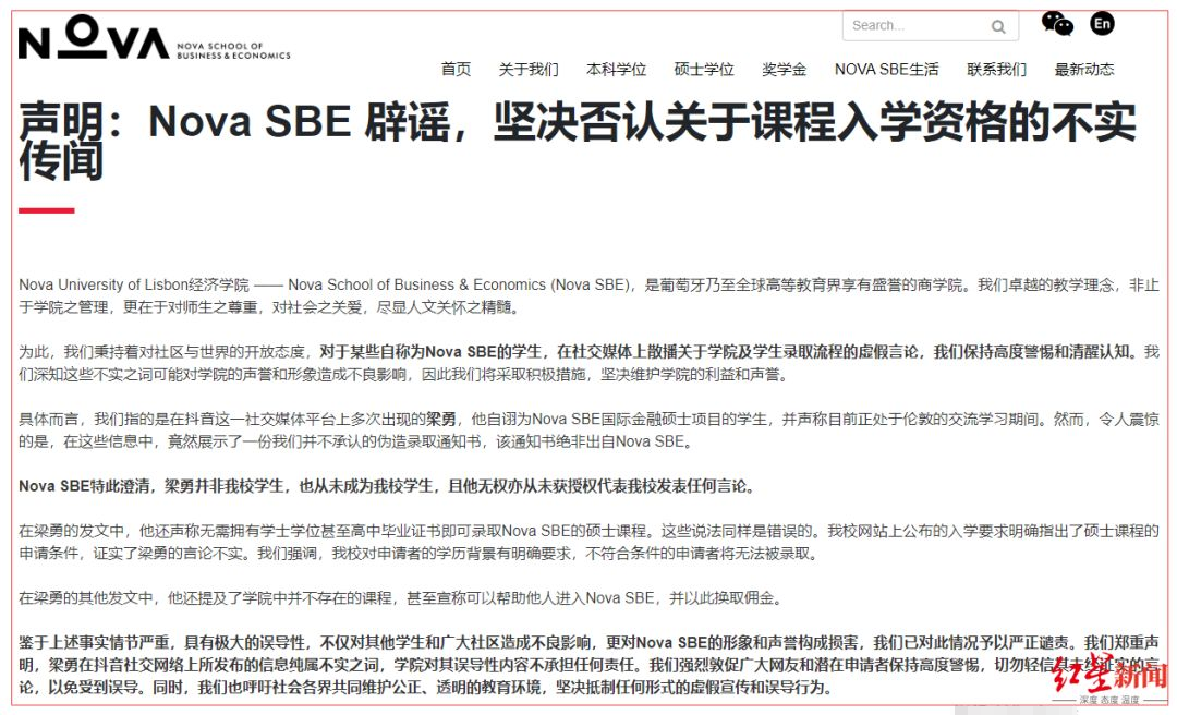 今年4月份,Nova SBE在官网中文页面上发表一则声明,声明中澄清,梁某并非我校学生,也从未成为我校学生,且他无权亦从未获授权代表我校发表任何言论。