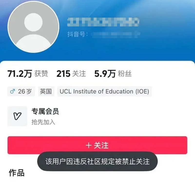 目前,梁某的抖音账号已经遭到了封禁。系统显示,该账号因违反社区规定被禁止关注,账号里的内容也被全部清空。