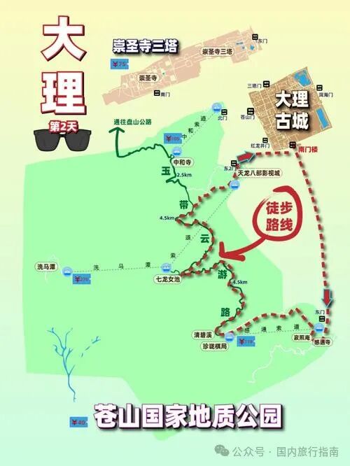 如果想从古城附近直接坐索道上山,那就直接去古城外的三月街附近乘坐苍山(中和)索道,直接到达中和寺,反方向走,最后从感通索道下山。天龙(洗马潭)索道是三条索道中景色最美的,会经过七龙女池和洗马潭。七龙女池是多个水潭组合在一起的自然景观,水质十分清冽。洗马潭和历史有关,当年元朝开国皇帝忽必烈带领部队进攻大理,采用了偷袭战术,翻过了苍山,期间战马曾经在这里停歇,因此叫“洗马潭”。至于选择哪两条索道上下,可以根据下面的景区图自行决定。
