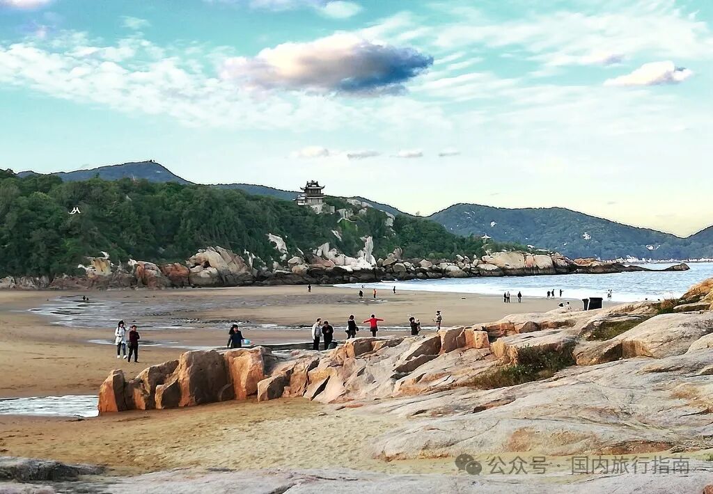 第一个是沙滩。普陀山因为四面环海,周围沙滩较多,其中最出名的是百步沙滩和千步沙滩。和一般沙滩不同,这两处沙滩的沙粒很细,在阳光照射下泛着微微的金色,好像是铺了一层地毯,走起来比较舒服,沙粒不沾人的脚。沙滩附近还有很多树林,夏秋季节郁郁葱葱,在沙滩上坐一会,感觉就和在三亚一样。