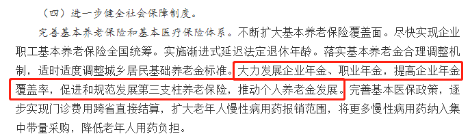 要发展企业年金、职业年金和第三支柱养老保险,推动个人养老。