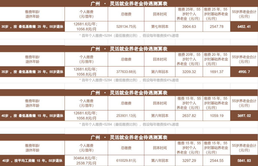 我专门以广州为例,详细测算了不同年龄,不同缴费档次,