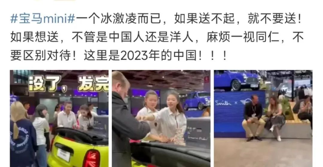 随着疫情放开,2023年大型车展重回线下。但4月份的上海车展上,宝马mini因为1个冰淇淋、2位员工小姐姐,和“区别对待中国人与外国人”的行为,而被骂上热搜!