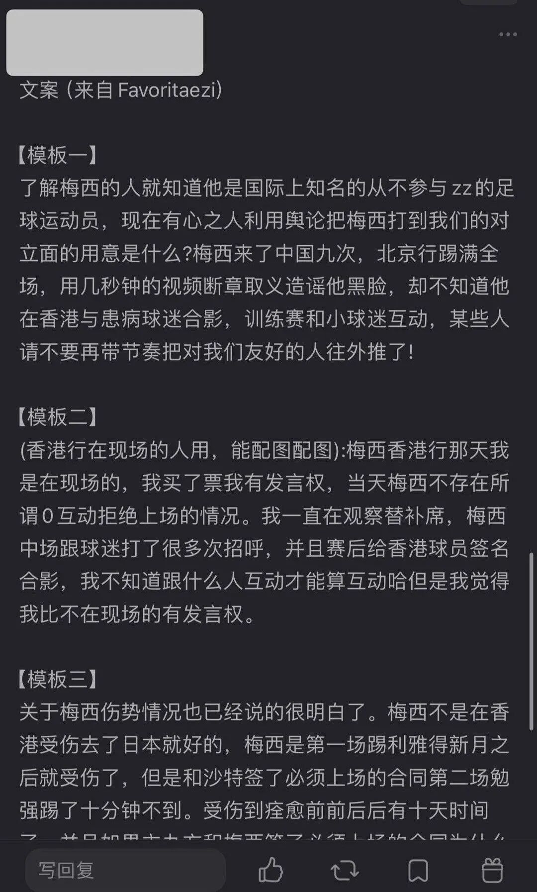 注意,这条微博里说的是“腹股沟有伤”,而梅西昨天的视频说的是“内收肌炎症”,连伤病详细都做不到统一,不正反映了梅西正牌经纪团队与国内合作方的沟通很敷衍吗?