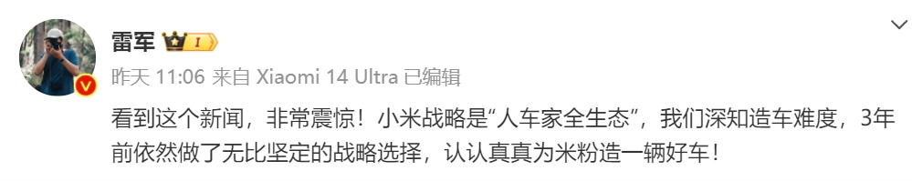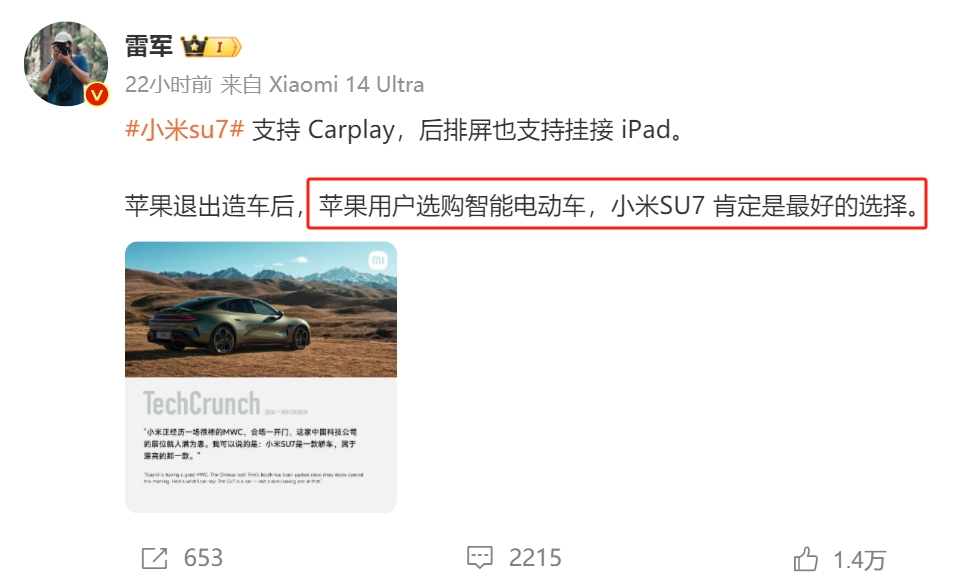 但震惊过后没多久,他就开始招安果粉,说什么小米SU7是苹果用户最好的选择。