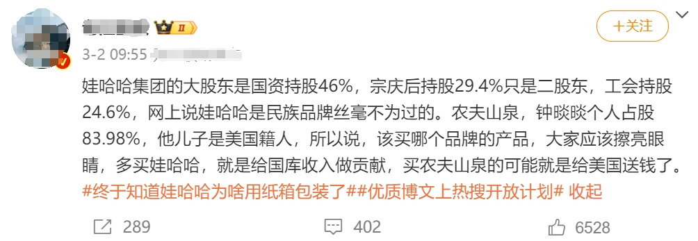另一方面却狂踩农夫山泉,甚至造谣钟睒睒“忘恩负义”、“任职娃哈哈时因冲货而被开除”、“第一桶金靠坑娃哈哈赚到”等等……