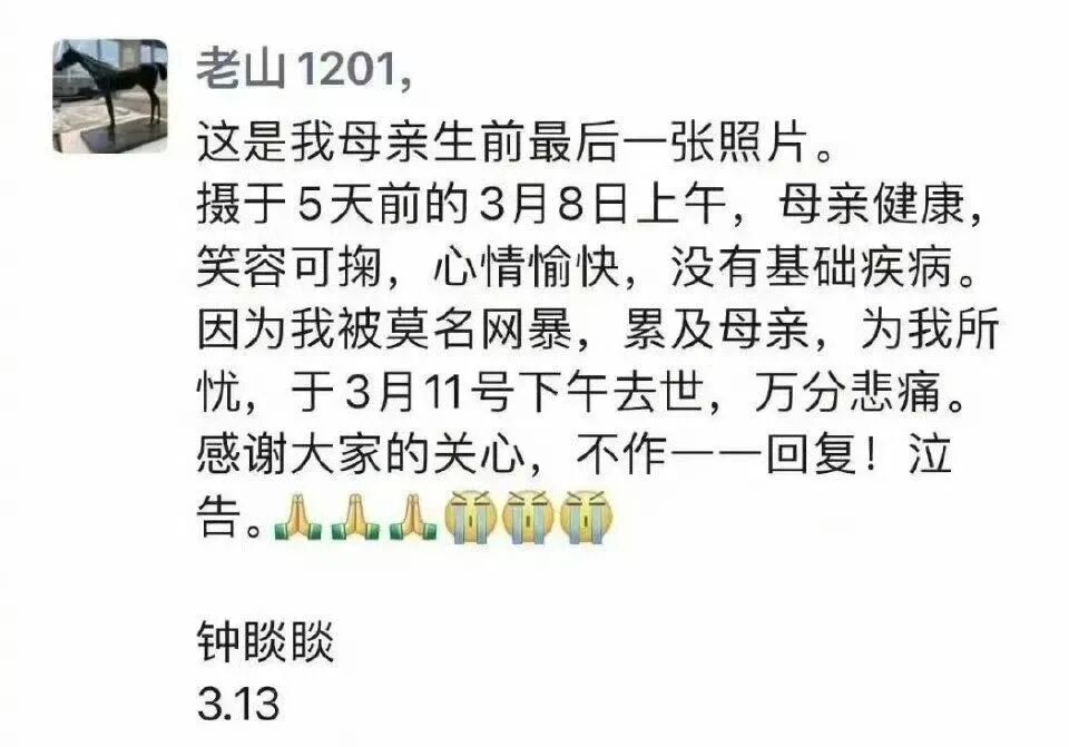 问题就出在这句话:“母亲健康,没有基础疾病,因为我被莫名网暴,累及母亲,为我所忧,于3月11号下午去世……”