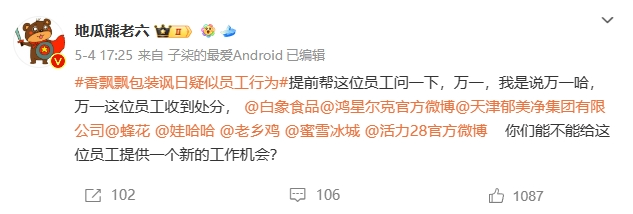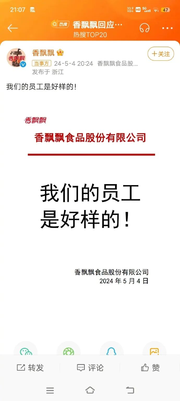 不过大家的担心是多余的,香飘飘不久就大方回应:“我们的员工是好样的!”