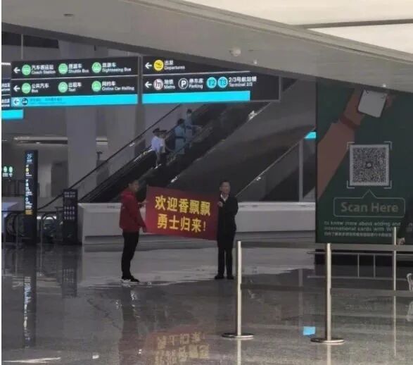 发了声明还不够,香飘飘董事长更加“懂事”,亲自打着横幅到机场迎接涉事员工:“欢迎香飘飘勇士归来”。