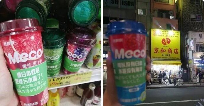 令人感到惊奇的是,这批香飘飘Meco的包装上用中日双语印着嘲讽日本核污染水的文字。