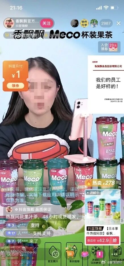 一时间,香飘飘的直播间被野性消费的网友挤满。显然香飘飘本身也是懂流量的,在直播中主推本次事件中的热搜同款果汁茶。