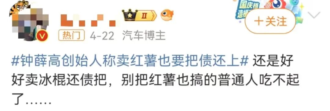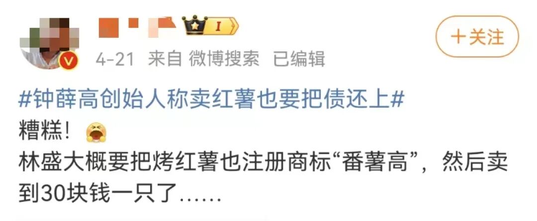 高价红薯本该由农业企业做的前期市场教育,由钟薛高林盛代劳了。但是林盛不是一个很好的人选,因为他身上“雪糕刺客”的标签,推广高价红薯很容易激起网友反感。
