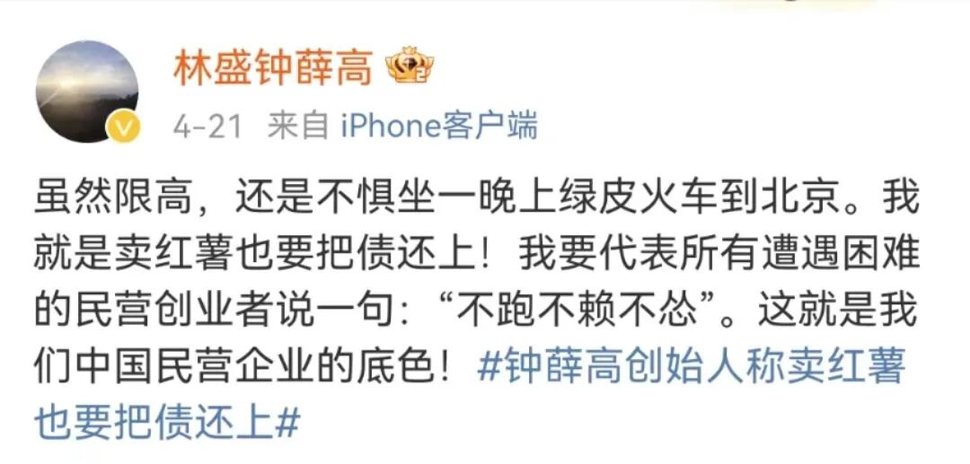 两个小时之后,林盛本人也发微博回应,确认了这个说法,并表态“不跑,不赖,不怂”,并强行代表了一把民营创业者。