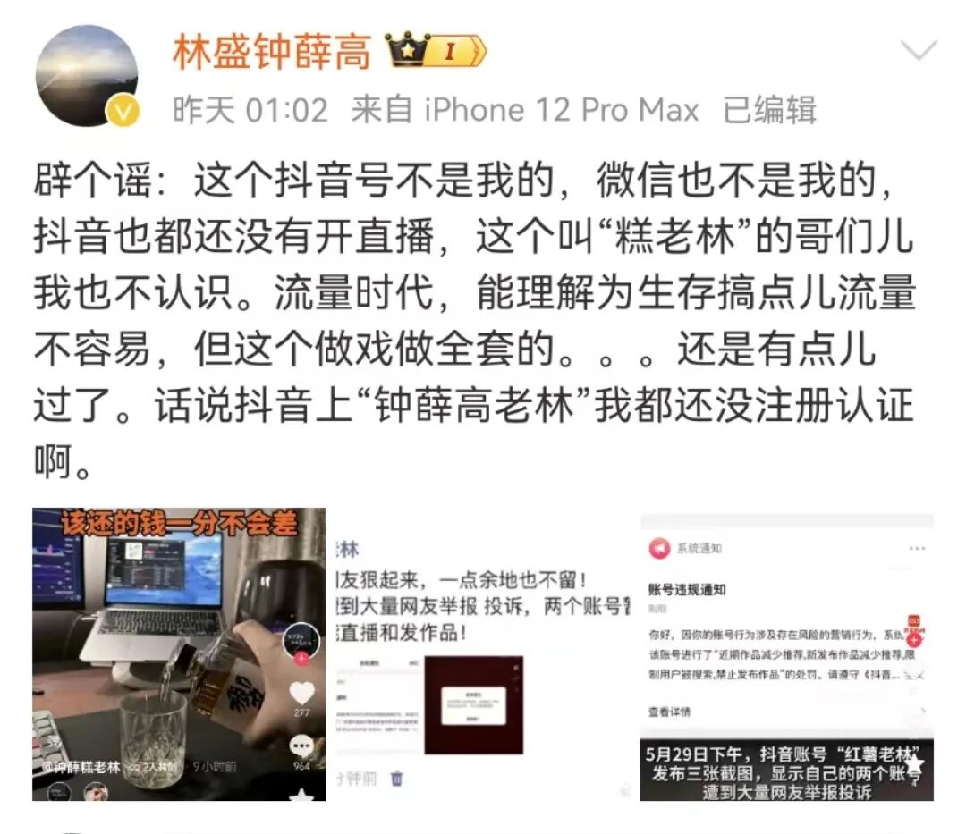 抖音上“钟薛高老林”账号没有注册认证,抖音上也都没有开直播,网传截图也不是他本人。