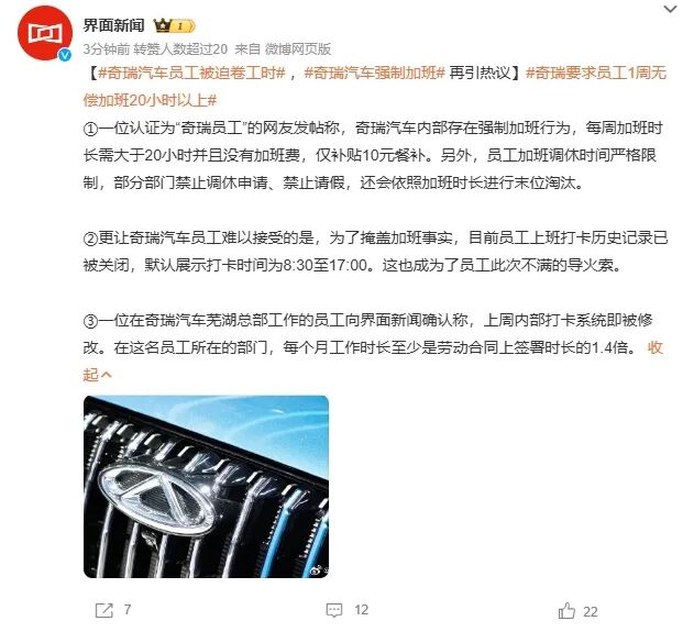 昨晚,“奇瑞汽车强制加班”的话题又在社交平台引发热议。