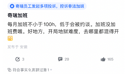 就拿本次的员工投诉风波来说,虽然能在社媒上引起一时的热议,但因为奇瑞不像比亚迪一样流量逆天,且目前的爆料都是奇瑞员工文字自述为主,缺少能激化情绪的素材(如之前Manner的冲突视频),所以热度一过大家也就忘了,奇瑞可能连个回应都没有。